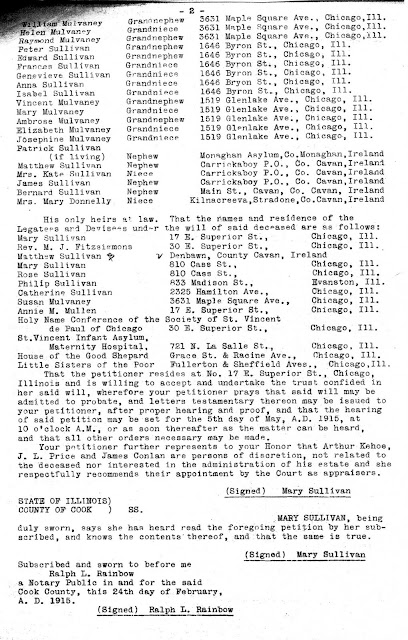 On February 26, 1915, Michael Sullivan's brother, Philip J. Sullivan, age 76, gave testimony in the Probate Court of Cook County before Judge Henry Horner in the matter of Proof of Heirship. Philip gave a 15 page statement, outlining all the next-of-kin of Michael.